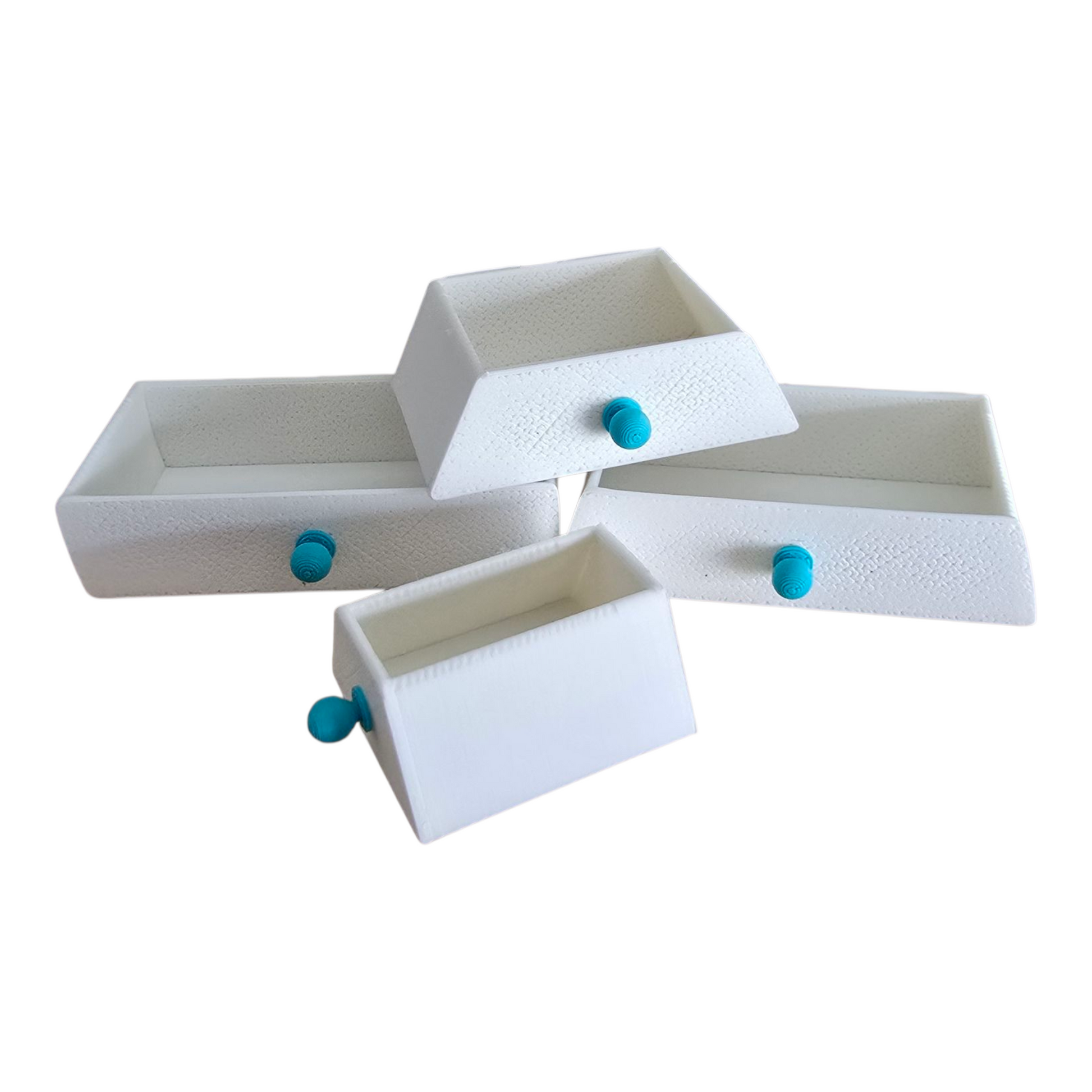Meet your new favorite catch‑all: a mid‑century‑meets‑kawaii cat with four smooth‑glide mini drawers. Designed and 3D printed in Australia, this compact organizer is ideal for jewelry, hair accessories, sewing notions, tabletop gaming pieces, office supplies and more. The striking turquoise eyes and knobs pop against the clean white body for a playful modern look that suits bedrooms, nurseries, studios and gift‑giving occasions.
